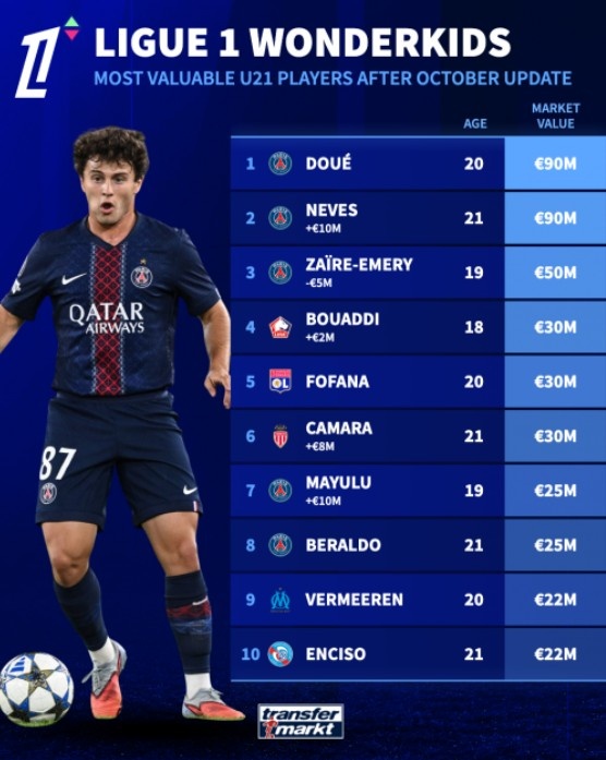 10月11日讯 德国转会市场更新了法甲球员最新身价情况,在U21球员中,杜埃和若昂-内维斯以9000万欧并列榜首,排名前10的球员中有5名都来自巴黎圣日耳曼。