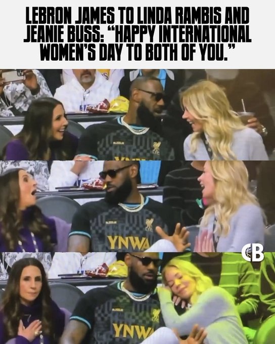 詹姆斯回应了他的一些著名网络热梗,比如2024年3月8日在湖人场边与湖人老板珍妮-巴斯以及高管琳达-兰比斯的“亲密”时刻。詹姆斯首先向珍妮和琳达送上妇女节快乐的祝福,两人听后十分欣喜,珍妮甚至一度娇羞地趴在詹姆斯肩头。