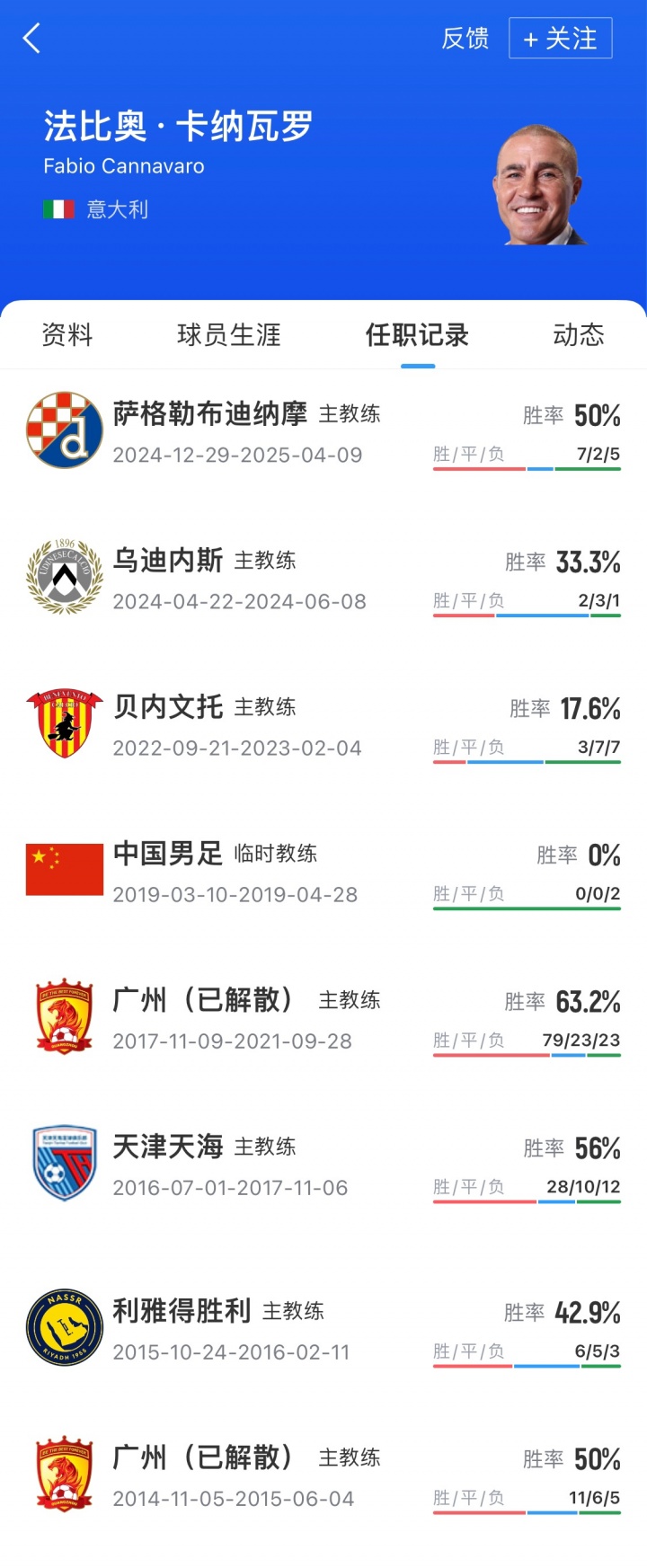 卡纳瓦罗现年52岁,曾执教广州恒大、利雅得胜利、天津权健、贝内文托、乌迪内斯和萨格勒布迪纳摩。2019年3月-4月,卡纳瓦罗曾出任国足临时主帅,带队征战中国杯,2场比赛均以0-1的比分不敌乌兹别克斯坦和泰国队。